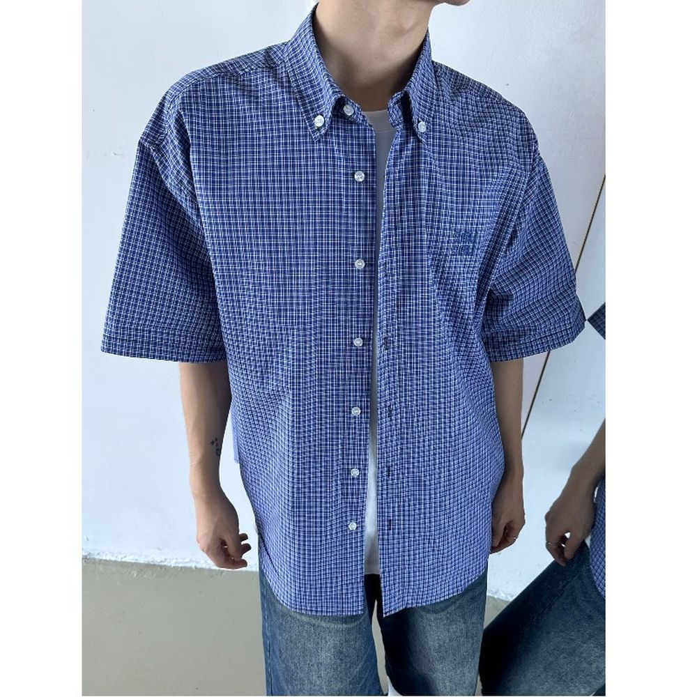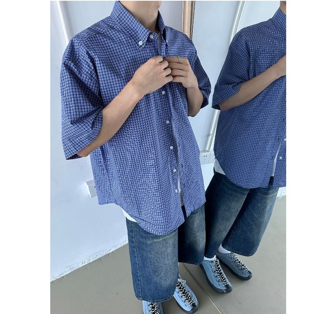 Men's Blue Plaid Shirt Short-Sleeved Summer Jacket