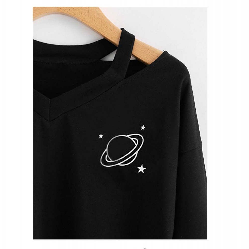 Hot Style V-Neck Hollow Planet Print Short Long-Sleeved T-Shirt
